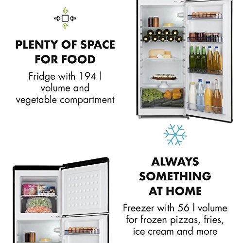 Specificaties: Klarstein Audrey Retro – koelkast, zuinig en milieuvriendelijk, 0 tot 10 ° C, 250 liter inhoud, 194 liter koelkast, 56 liter vriezer, zwartgrijs
