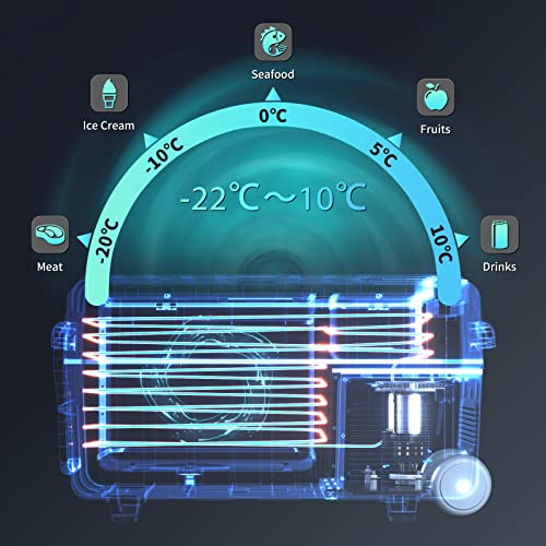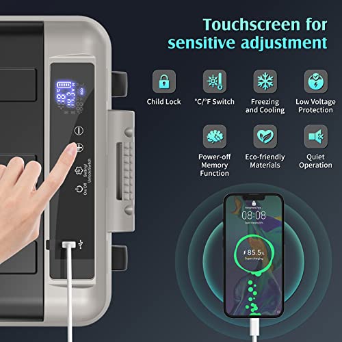 【ŁATWY W UŻYCIU】: Twarda chłodnica jest wyposażona w ekran dotykowy LED, który umożliwia łatwe wprowadzanie ustawień i monitorowanie trybu pracy w dowolnym momencie. Interfejs USB może ładować telefon komórkowy na zewnątrz. Oświetlenie wnętrza ułatwia zbieranie jedzenia w ciemności. Osłona z amortyzatorem zapobiega wstrząsom